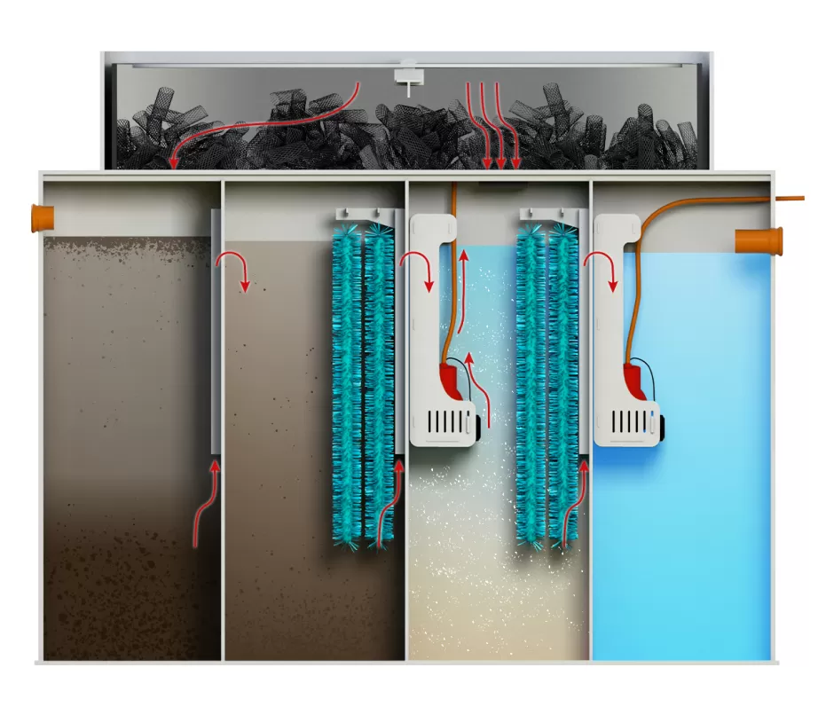 Предполагается установка мини КНС с насосами и дробилками, и с ее помощью стоки подаются в СБО